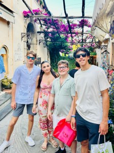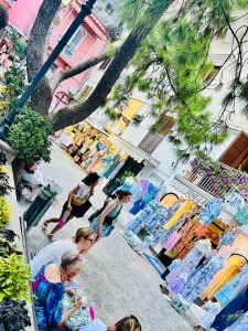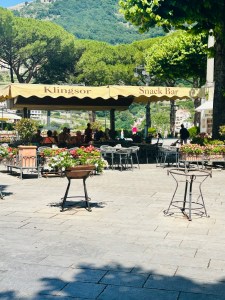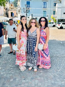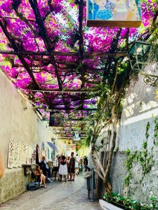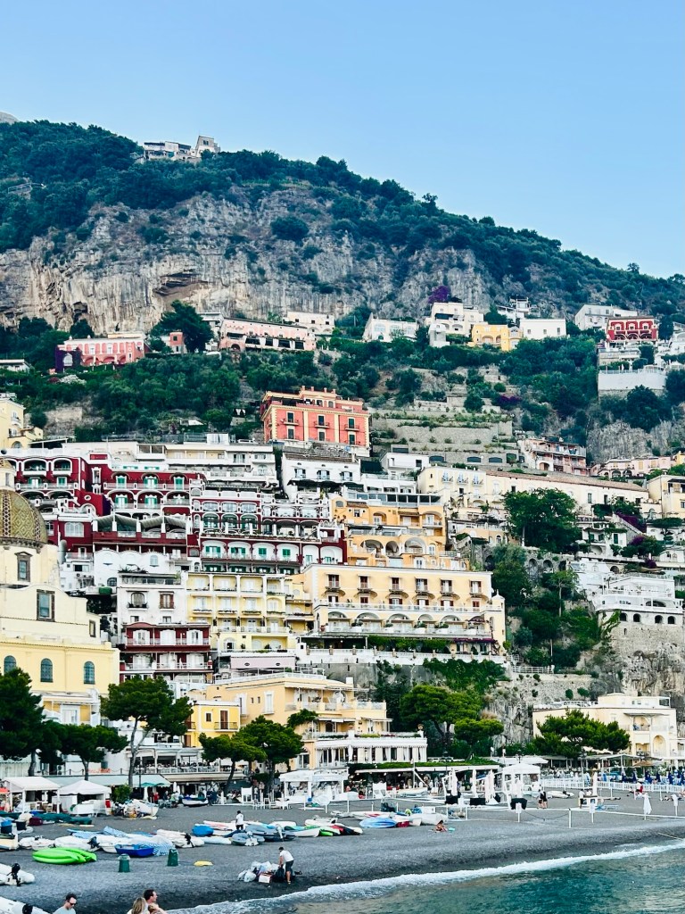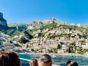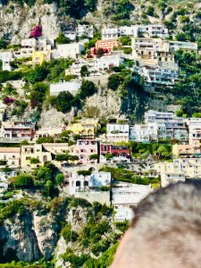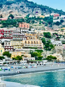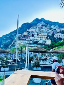 We then ventured out to the winding shopping areas. There were so many quaint shops, with colorful clothing, ceramics and jewelry. It was a bit of a maze, but actually really fun to explore. My daughter was dying to go to CB Positano (https://cbpositano.myshopify.com/), and if we didn’t ask directions, we likely would not have found it. The store was adorable with vintage inspired patchwork dresses, bags and accessories. According to my daughter, a MUST visit. Definitely take your time popping into shops and down hidden walkways, where you will discover the most unique finds. My son bought a beautiful painting (print) of Positano at Art & Craft Positano (https://www.artandcraft-positano.it/artisti-in-galleria/angeloni-giancarlo/). We also purchased some jewelry and Positano-themed souvenirs. Our ferry to head on Amalfi was at 8:00 pm (€ 10), so we headed back to the beach area and stopped at the Ocean Bar (https://www.lincantopositano.com/en/ocean-bar/) until it was time to head to our ferry. A PERFECT spot, right on the beach with views of the many boats in the harbor while light misting fans blew in our faces and great music played in the background… all while sipping some delicious drinks!