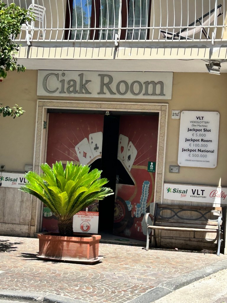We stayed about 2.5 hours and then headed back to the hotel. When we got back most people wanted to relax and rest, but not me!!! I decided time to explore a little. First stop…. this cute little place that I spotted the day previous. RIGHT NEXT TO THE HOTEL. I didn’t tell anyone where I was going…but I made it to the Ciosk (aka Casino). So I felt like I was doing something wrong and it reminded me of the OTB (Off Track Betting) places from the 70’s back home. I’m pretty sure they unlock the door to these places in the morning and leave. I went in, I was the only one there, I even called out “hello”, with no answer. Each slot machine had a standing ashtray that I’m pretty sure I purchased for my grandparents in 1982. I decided to play the first slot machine and held the door open with my foot while Facetiming my friend (one can never be too careful)! And what do you know… Cha-Ching! I won! I ended up cashing out 42 euros up and went and got some bottles of wine to share my good wealth. I purchased the same that we enjoyed the evening before at dinner.