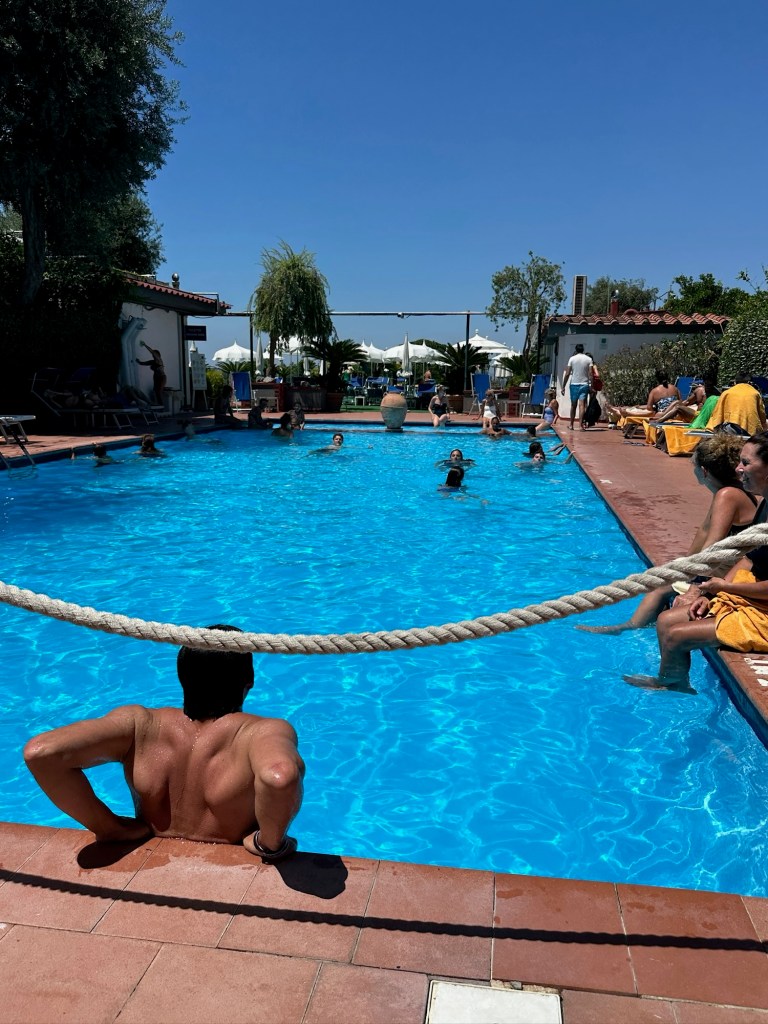 The pool was a nice size and very clean. It had a very shallow end (maybe a foot deep) for families with very small kids, and the rest was large enough for multiple families to frolic… ours chose the ole Marco Polo pool game. There was also an area beyond the pool with a ton of lounge chairs, tables and umbrellas. The drinks from the outdoor bar were very good, however, would not personally recommend the food. Did not think it would be possible to have a lousy meal anywhere in Italy, but here we are being served frozen chicken patties, again! (still frozen), and burgers with zero flavor. The French fries were crisp on the outside, hard and grainy in the inside… my recommendation would be to grab a little sandwich or snack from one of the many little shops or delis next to the hotel and bring to the pool area!